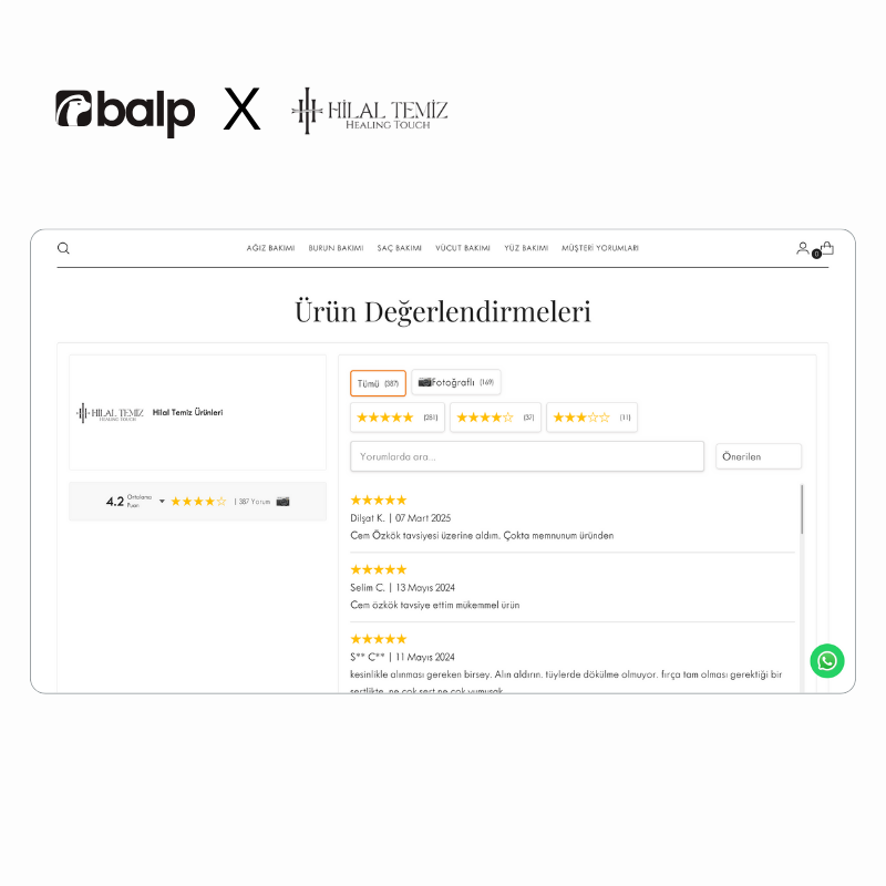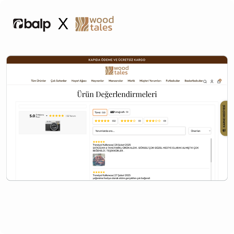 Gerçek müşteri yorumları, marka güvenilirliğini artırır, satın alma kararlarını hızlandırır ve dönüşüm oranınızı yükseltir. Pazaryerindeki başarınızı, kendi e-ticaret sitenize taşımanız için etkili bir yoldur.
