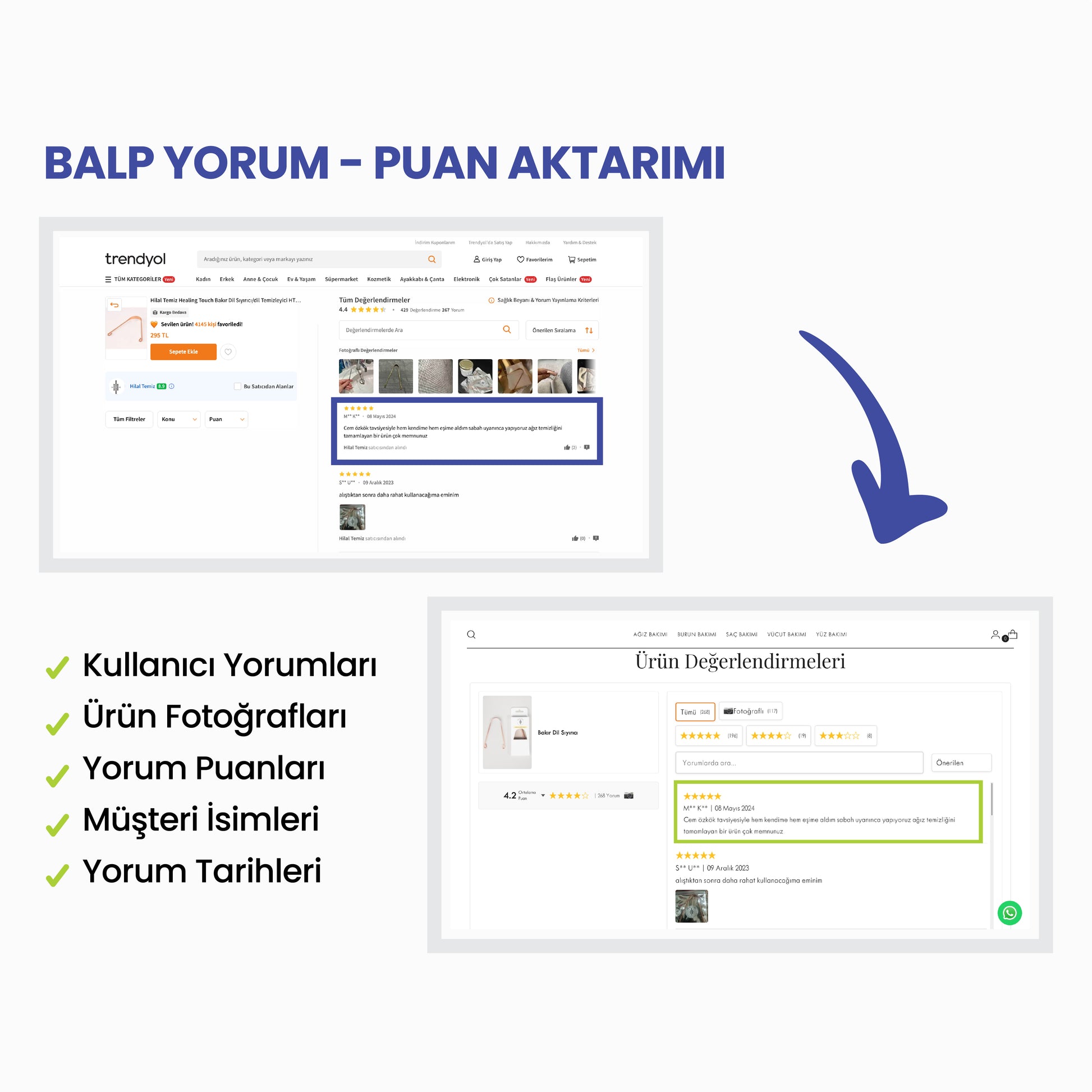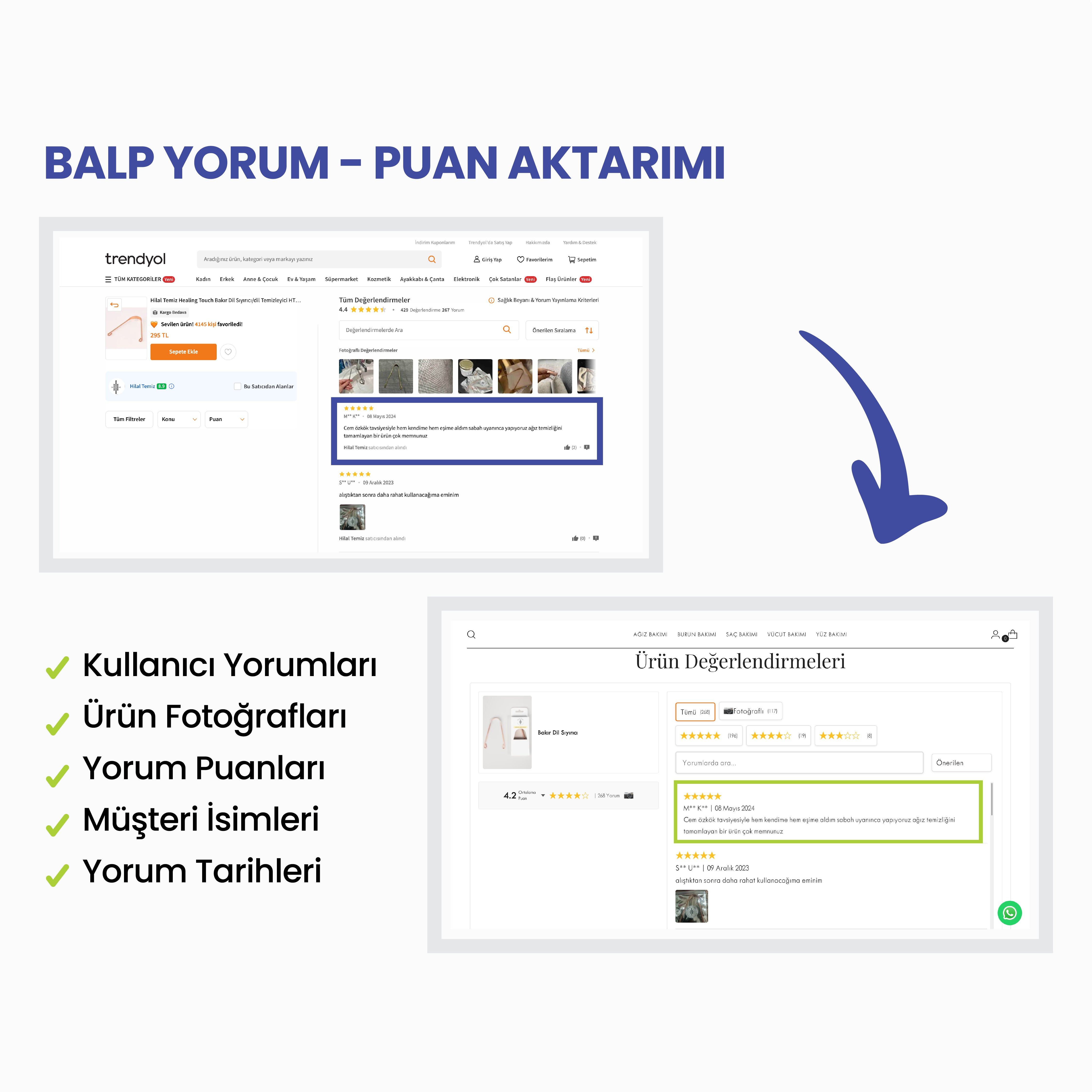 Trendyol ve Hepsiburada gibi pazaryerlerinde yer alan ürün yorumlarını web sitenize entegre ediyoruz. Böylece potansiyel müşteriler, ürünle ilgili gerçek kullanıcı yorumlarını siteniz üzerinden görebiliyor.